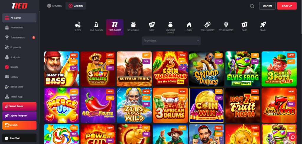 | 🎲 Game Types | Slots, Live casino, 1RED Games, Bonus Buy, New, Jackpot Games, Table games, Other games, Card, Crash |