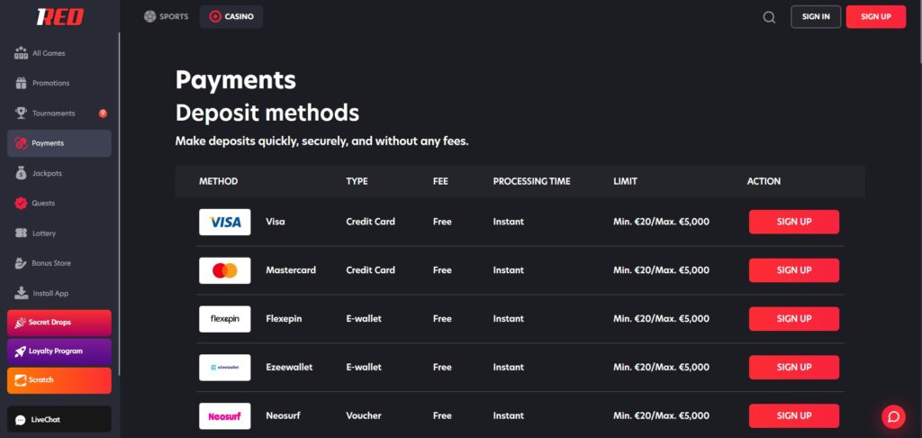 No, deposits at 1Red Casino are processed without extra fees from the casino’s side. However, your payment provider may charge a small fee.