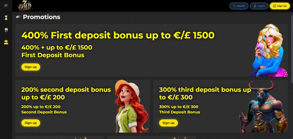 7Gold Casino offers a clear and generous bonus program that supports players from their first deposit and continues with regular rewards. The system includes large multi-stage welcome bonuses, weekly tournaments with high prize pools, and cashback for active players.
