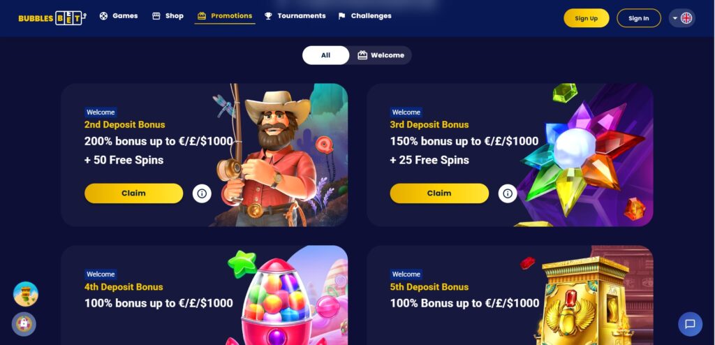 BubblesBet Casino offers a rewarding welcome package across the first five deposits, giving players a strong boost to their gameplay. Below is a breakdown of the available bonuses:
