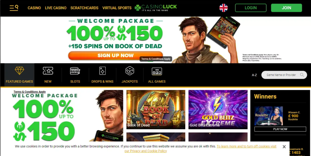 New members at Casinoluck can get a 100% matched bonus up to $150 and also 50 free no deposit spins on Book of Dead, with no deposit needed. This deal is open to all newcomers, but those from the UK can’t claim it. UK players have their own different welcome deal.