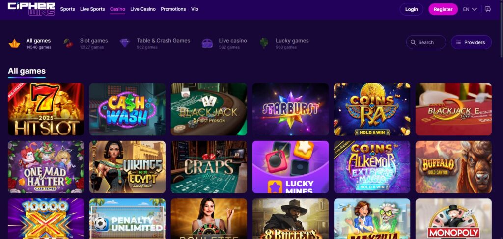 Cipherwins Casino features an enormous collection of over 14,600 games, offering something for every type of player. The game library is divided into clear categories, including slots, table games, live dealer titles, and instant-win games. Below is a closer look at each section and the games that stand out within them.