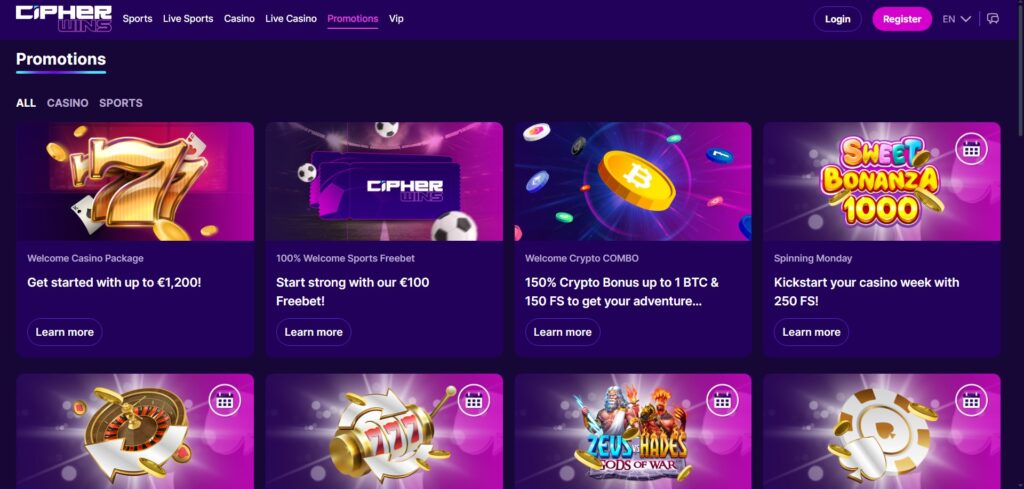 Cipherwins Casino offers a wide range of promotions tailored to different player preferences. Here’s a complete breakdown of the casino, crypto, sports, and VIP bonuses available.