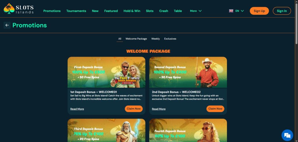 Slots Islands Casino provides several types of bonuses designed to reward both new players and regular depositors. Below is a breakdown of the welcome package, ongoing promotions, and seasonal tournaments. All bonuses have a 30x wagering requirement unless stated otherwise.