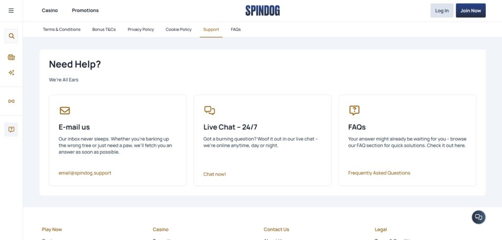 SpinDog Casino offers multiple customer support channels to assist players with questions or issues: