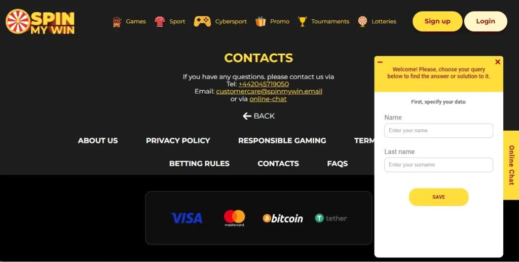 You can contact Spin My Win customer support through the Live Chat feature or by email. The team is available 24/7 to answer any questions you may have.